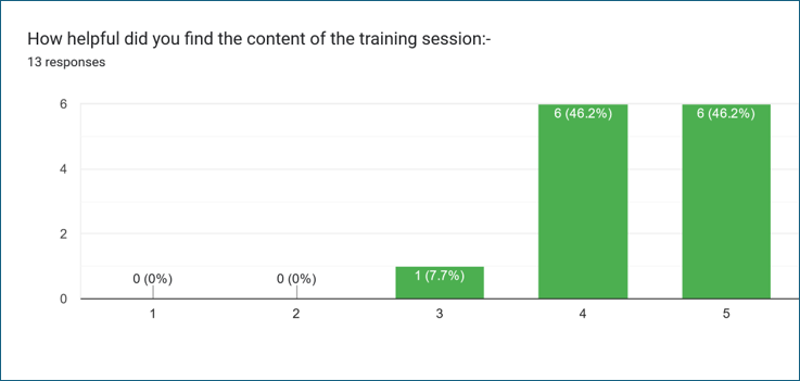 92% of teachers found the content of the training very to highly beneficial, while one teacher rated the training average.