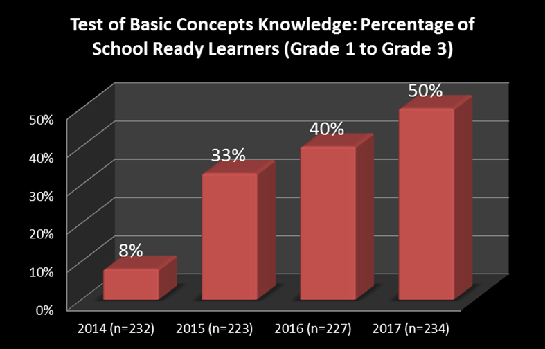 After the third year of intervention (2017) there was a further 10% increase in the number of school ready learners. 50% of all learners were school ready.