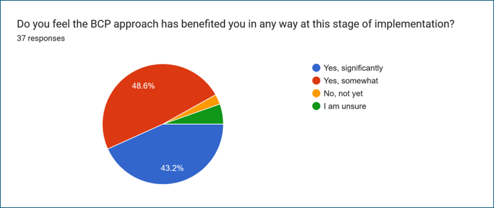 Nearly all teachers (over 90%) report that the BCP has already benefited them, with almost half experiencing significant impact. Only a small minority remain unsure or have not yet felt the benefits.
