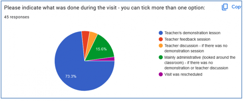 The majority (73%) of support visits to the project schools involve a demonstration lesson. This indicates that the majority of teachers are trying to implement the programme.