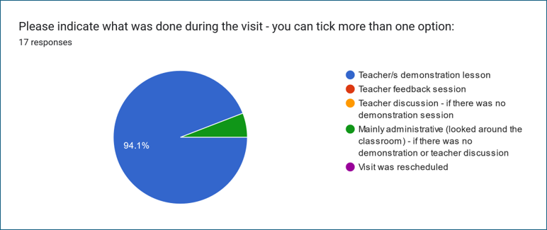 A total of 49 teachers were visited at the project schools, with an average duration of 50 minutes per visit.