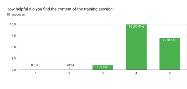 94% of teachers found the content of the training very beneficial, while one teacher rated the content as average.